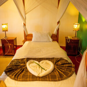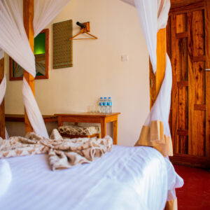 This enhanced balcony retreat offers extra space and a romantic outdoor seating area. With Swahili-styled architecture, elegant bedding, portable fans, and a private en-suite, it’s thoughtfully designed for comfort, connection, and scenic serenity.